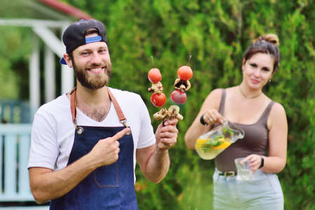 bearded handsome man smiling holding skewers with barbecue vegetables in his hands against the background of a girlfriend who pours fresh lemonade
