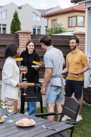 Smiling multiethnic friends with wine and food on plates standing near grill in backyard