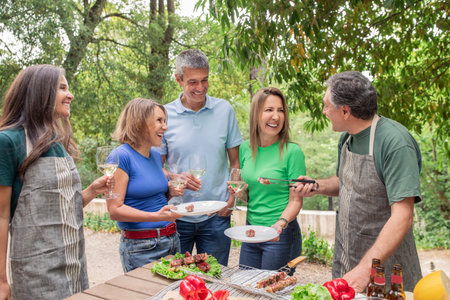 Group Of Happy Mature People Having Barbeque Grill Party Outdoors