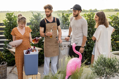 Happy friends hang out on a picnic, grilling food and standing with alcohol drinks at backyard on nature. Small group of people cooking and spending summertime outdoors