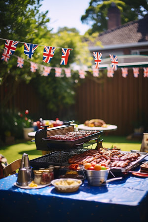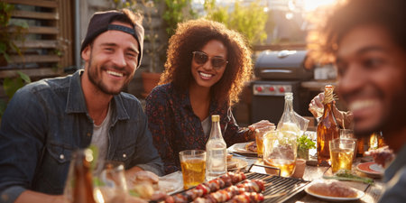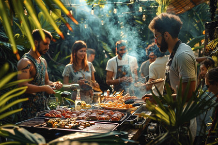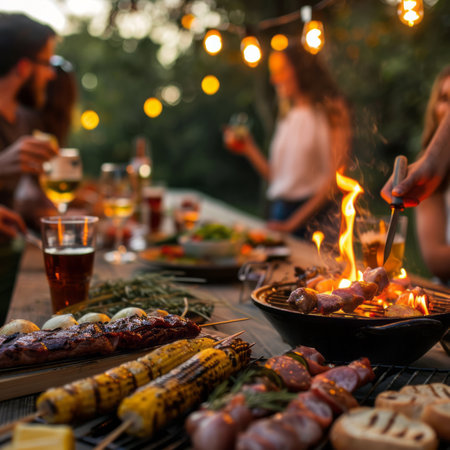 Enjoying a colorful evening barbecue with friends in a charming garden