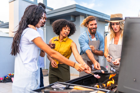 Cheerful friends roasting marshmallows on skewers over a barbecue grill during a rooftop party