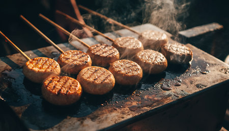 A vibrant scene of grilled meat sizzling over charcoal, surrounded by softly glowing flames. The smoke rises against a twilight background, evoking a sense of warmth and outdoor enjoyment. Perfect for showcasing culinary delights and summer gatherings.