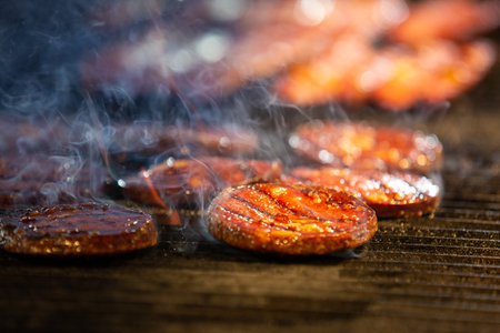 Closeup of grilled burger cutlets. Burger barbeque. BBQ, grilling, fire.