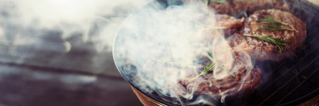 Juicy entrecote steaks cooking on a charcoal grill with fresh rosemary and gentle smoke. Close-up of grilled beef with beautiful grill marks and blurred wooden background. Perfect for concepts of barbecue, summer cooking, gourmet food, and outdoor dining