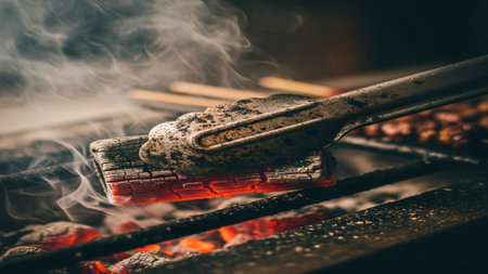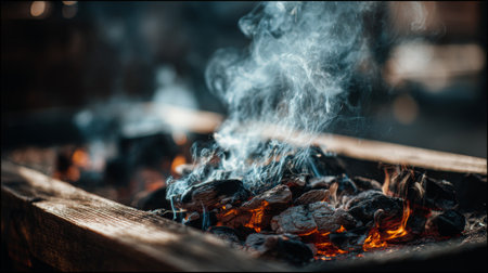 Captivating scene of glowing charcoal fire with rising smoke, evoking warmth and comfort during an outdoor gathering, perfect for culinary or nature themes.