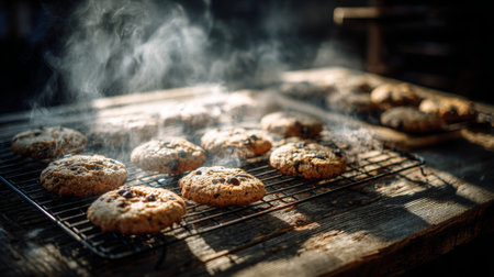 Freshly baked cookies rest on a cooling rack, releasing steam and inviting aromas. This image captures the warmth and coziness of homemade baking in a rustic kitchen.