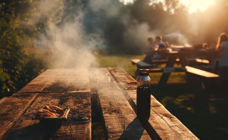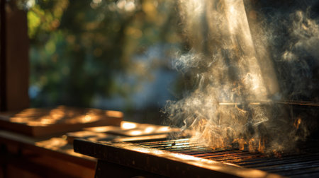 Captivating scene of smoke emanating from a barbecue grill, set against a backdrop of nature, highlighting the joy of outdoor cooking and social gatherings.