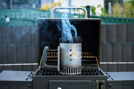 Metal chimney starter with smoking charcoal briquettes on grill. Concept of outdoor cooking, grilling preparation and backyard barbecue