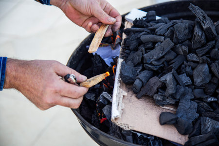 Close-up of a caucasian man burning coals in a barbecue