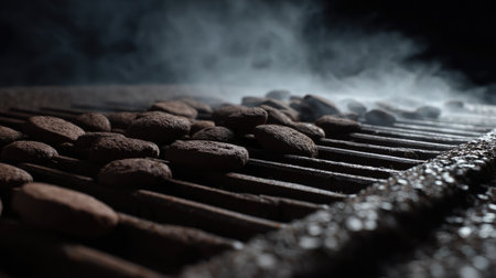 Detailed view of smoke emerging from a barbecue grill, with sizzling food and a smoky atmosphere