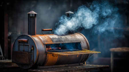 Old fashioned barbecue grill with smoke and firewood in the background.
