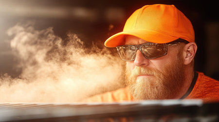 A man wearing sunglasses and an orange cap intensely monitors food cooking on a grill, surrounded by steam.