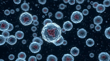 An intriguing close-up view of microscopic cells floating in a dark background, illustrating the complexity of biological structures and cellular environments.