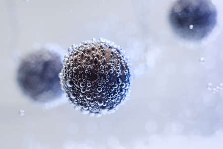 Close-up of microscopic virus cells in blue, floating in space, copy space available.