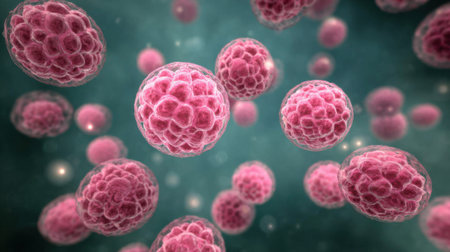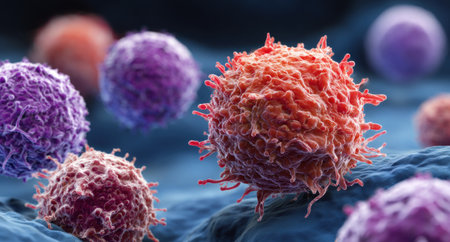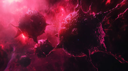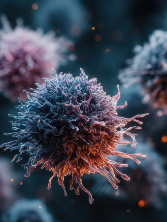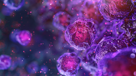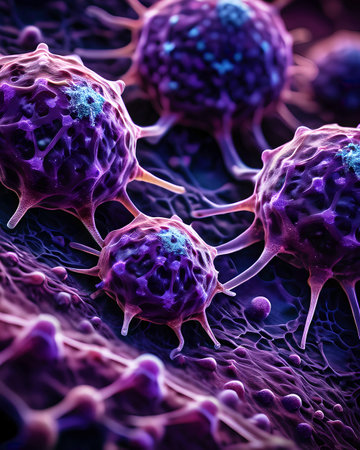 Stunning macro imagery that captures the fascinating details of cancer cells within a dynamic environment, showing their complex structure and unique characteristics