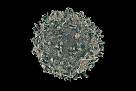 Digital illustration of white blood cell in color background with blue and purple cells.