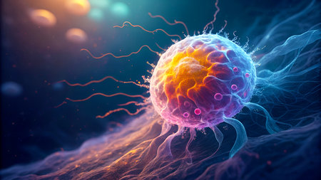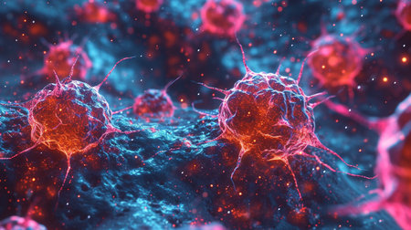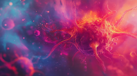 Close up of glowing cancer cells on a vibrant backdrop, highlighting their unique structure and activity in a biomedical context.