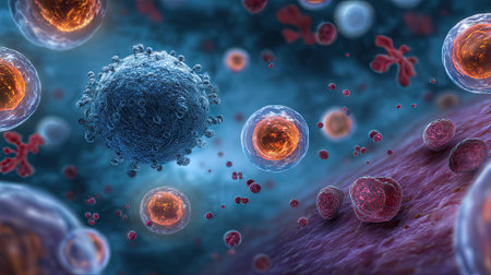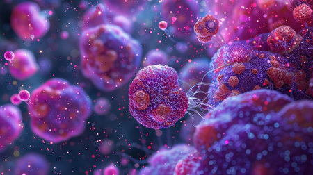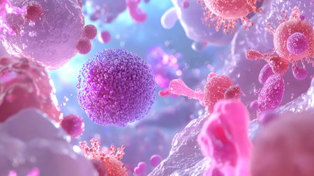 This illustration captures a detailed microscopic view of immune cells interacting with pathogens in a vibrant biological environment, showcasing cellular dynamics.