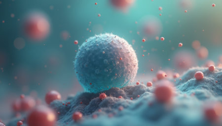 This stunning image captures a mesmerizing microscopic scene, showcasing a large, textured cell surrounded by smaller, glowing particles in a dreamy, ethereal atmosphere. The soft focus and vibrant colors create a sense of wonder, inviting viewers to explore the intricate beauty of life at a cellular level.