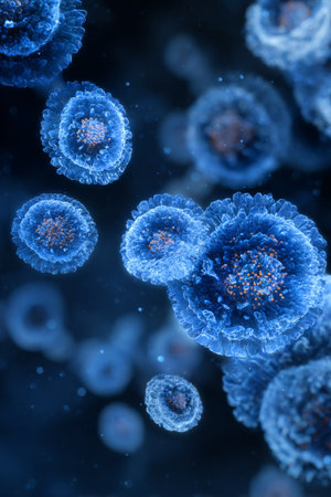 Detailed 3D Medical Illustration of a Group of Microscopic Viral Particles or Cancer Cells in Purple, Blue, and Orange Hues, Representing Virology, Immunology, and Disease Research.