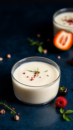 A creamy mixture is being prepared in a bowl, surrounded by fresh ingredients like milk, nuts, and herbs.