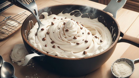 Delightful moment in the kitchen as cream is whipped to a smooth consistency, ready for baking delicious treats or desserts.