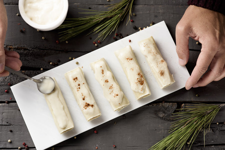 closeup of a young caucasian man preparing some meat stuffed cannelloni on a rustic wooden table