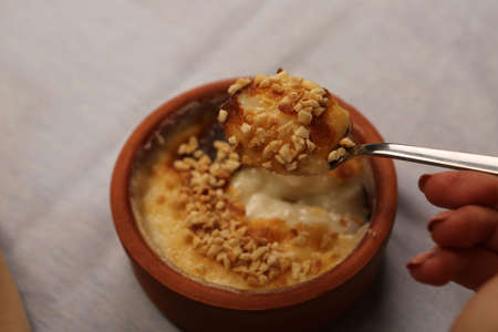 Baked rice pudding turkish milky dessert sutlac in earthenware casserole with hazelnuts