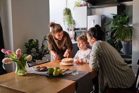 Lesbian couple giving birthday cake with candle to their little son at table in kitchen