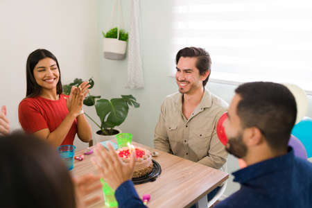 We wish you many more birthdays. Loving friends clapping and singing happy birthday to a handsome young man. Friends attending a birthday party
