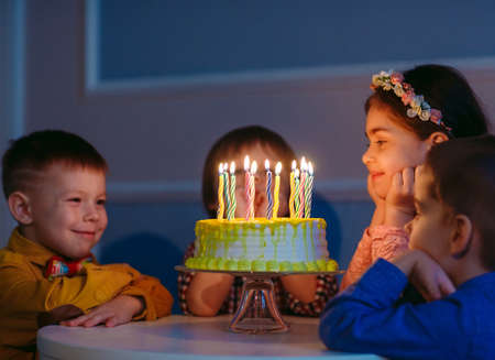 Childrens birthday. Children near a birthday cake with candles