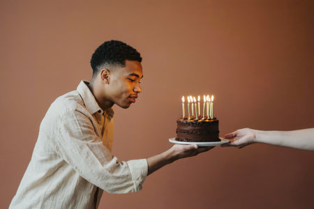 AI Generative Young man blowing out candles on cake, happy birthday celebration