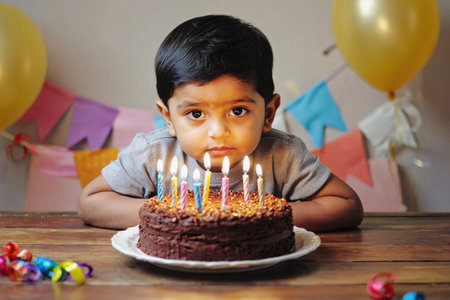 AI Generative Kid boy blowing out candles on cake, children's birthday celebration