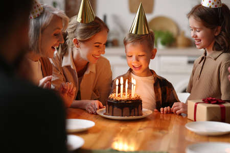 Happy little boy making wish and going to blow candles on cake while celebrating Birthday with big family parents, grandlarents and sister wearing party hats, child receiving congratulations at home