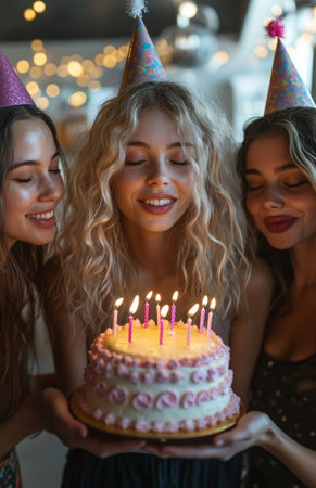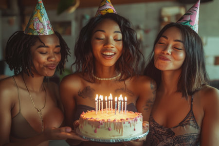 friends blowing birthday candles together. togetherness, making a wish, close, friends, concept