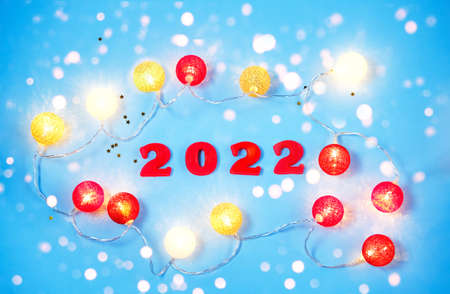 Wooden cubes with the word 2022 on the background of a Christmas tree