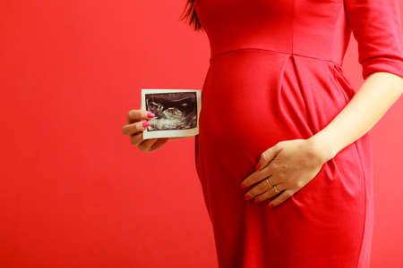 New life concept. Pregnancy, motherhood and happiness. Closeup tummy of pregnant woman wearing elegant red dress, ultrasound scan in hand indoor