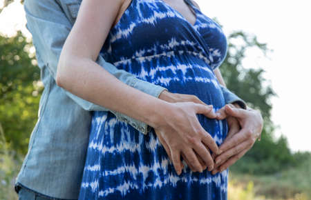 A young couple expecting their first child - hands held in shape of heart of her belly. Close-up