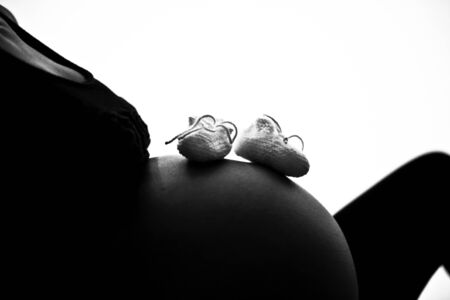 Photo of a pregnant woman's belly and tiny shoes on top of it.