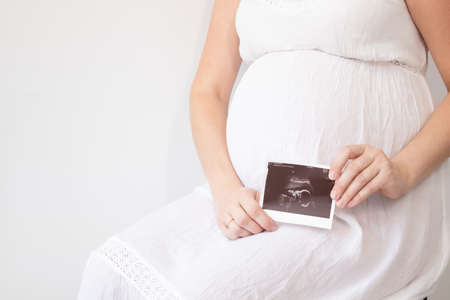 Pregnant woman holding ultrasound image. Concept of pregnancy, health care, gynecology, medicine. Young mother waiting of the baby. Close-up, copy space, indoors.
