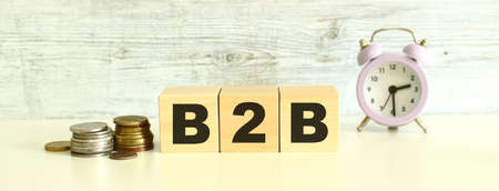 There are three wooden cubes with letters on the table next to the coins. The word B2B. On a gray background.