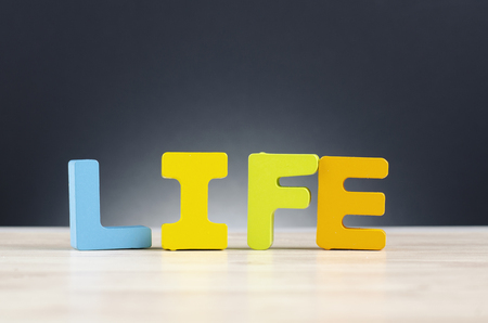 Motivational and inspirational word - LIFE written on wooden blocks. Blurred styled background.