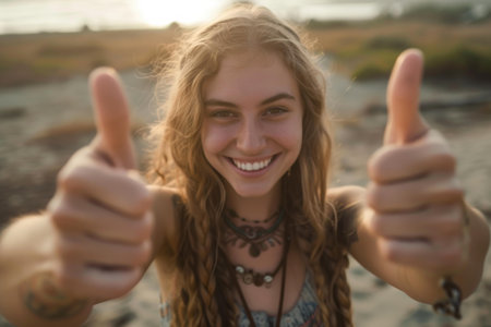 Cheerful young lady with curly hair showing approval with thumbs up during a beautiful sunset