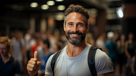 A joyful man with a shaved head and a broad smile enthusiastically shows double thumbs up against a light background. His expression radiates positivity and confidence, making it a perfect image for conveying success and happiness.