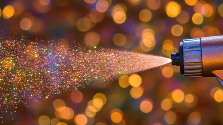 A close-up image of a glitter spray tool releasing colorful glitter against a beautifully blurred bokeh background filled with light effects.