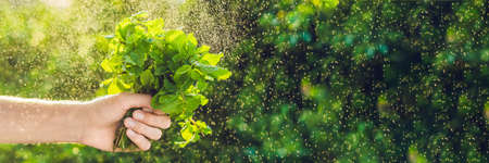 BANNER bunch of mint in hand and a splash of water against the green background. Long Fo.rmat