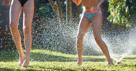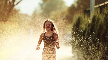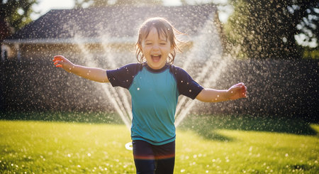 A joyful young child with arms outstretched laughs with delight while running through a garden sprinkler on a sunny summer day. The water sprays in the air, catching the backlight from the sun, creating a perfect image of childhood fun and refreshment.