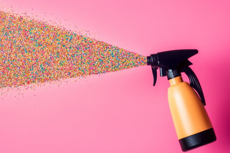 A vibrant service sprayer filled with colorful sprinkles is creating a festive explosion against a bright solid backdrop, evoking joy.