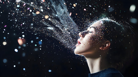 Woman surrounded by sparkling glitter in a dark background, exhaling particles into the air, creating a magical and dreamy atmosphere.